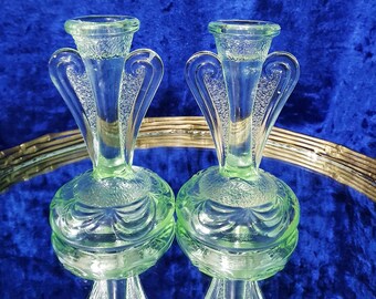 Uranium glass pressed glass decor. green glass Bagley Glass Rutland pattern 3078 pair of art deco candlestick holders depression glass